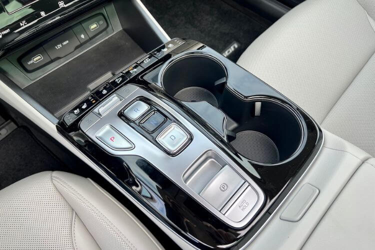 I'm a fan of the slim center console design with its sleek silver trim. It's clear designers spent time on ergonomics. Controls for some of the climate and other functions are within reach of your fingertips ahead of the shift-by-wire transmission. There are also large cupholders and controls for the drive modes, parking brake, auto brake hold and to turn of Idle Stop/Start.