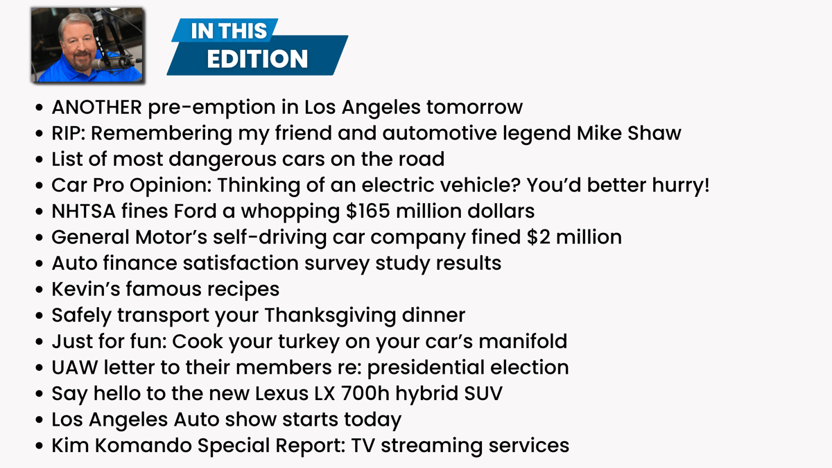 A couple of automakers’ wallets are lighter after NHTSA fined Ford, and the Department of Justice fined General Motors' Cruise, LLC, details are below. Which auto finance company has the most satisfied customers? Scroll down to find out, and Los Angeles listeners, your fantastic Auto Show starts today. If you are going to buy something by the end of the year, go see them all at the show!