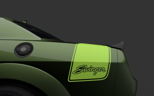 The Swinger models - only available in Widebody form - are a modern take on the unique retro style of the Dodge brand's "swinging" muscle car lineup of the late 1960s and early 1970s. The original Dodge Dart Swinger was a member of the Dodge "Scat Pack" club, which Dodge describes as packing formidable horsepower into a compact package. Available features included green-on-green interior/exterior color combinations, gold color accents and wood panel interior touches.