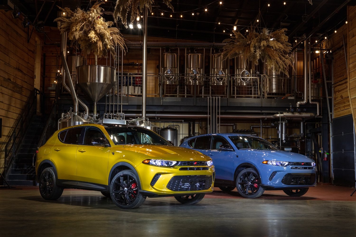 2023 Dodge Hornet GT (left), shown in Acapulco Gold, and 2024 Dodge Hornet R/T, shown in Blue Steele. Credit: Stellantis.