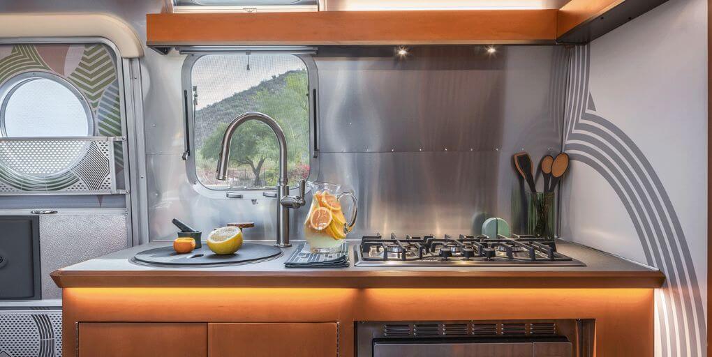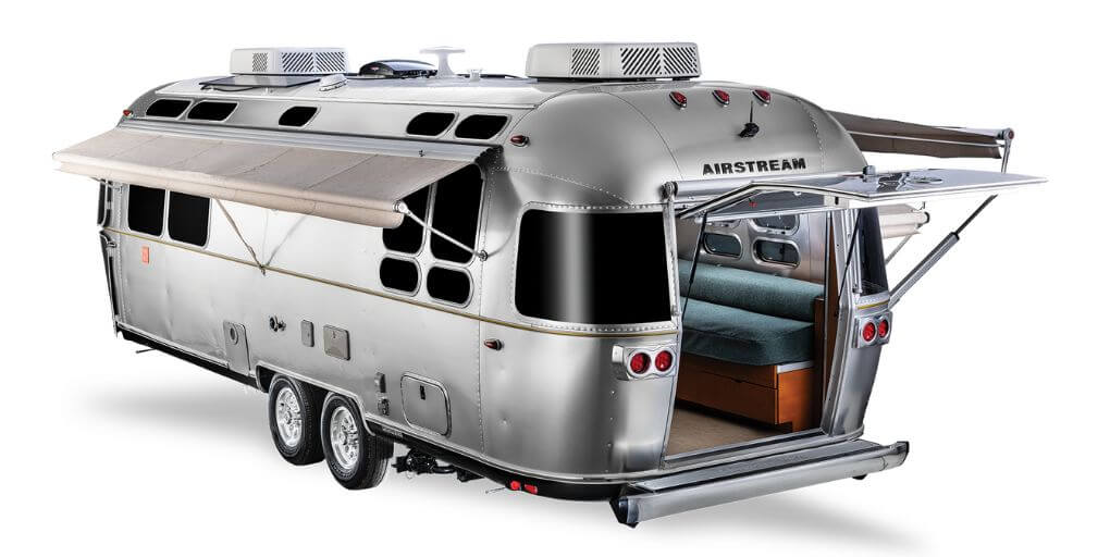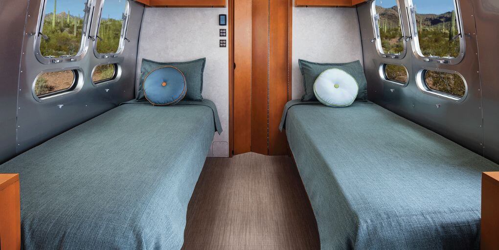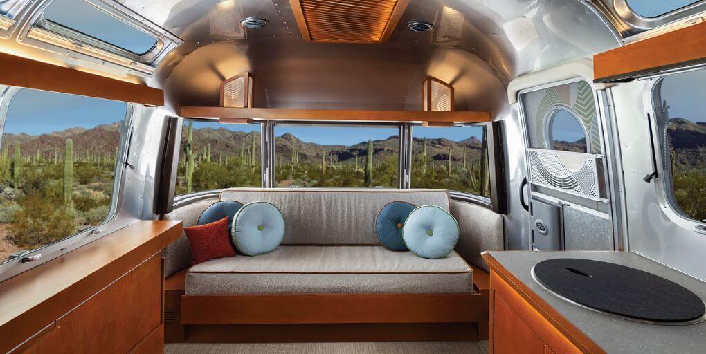 The unit is standard equipped with Airstream's popular rear hatch feature, providing a sweeping panoramic view from the convertible lounge and sleeping space. Where many Airstream travel trailers feature a convertible dinette inside the hatch, this model uniquely positions the primary sleeping area at its rear. Two twin beds, which double as bench seating, convert with the push of a button into a king-sized bed– the largest option in Airstream's fleet— reminiscent of the gaucho beds found in 1950-1960s era Airstreams.