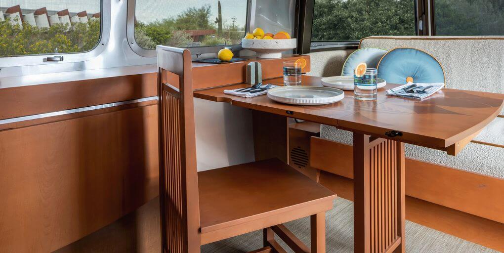 Photo: Airstream.Another unique convertible feature is found in the front living space. The dining table and separate desk space both collapse into a wall cabinet. This creates room for a pull-out sofa that doubles as a secondary sleeping area. Two collapsible Wright-inspired chairs and a collapsible stool tuck away inside the wall cabinet behind the lowered desk and table.