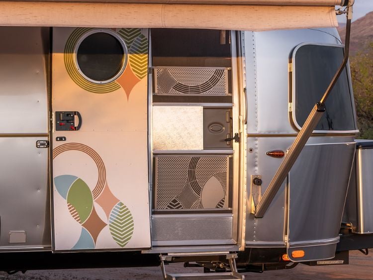 Photo: Airstream.Another design element seen throughout the trailer is a Gordon Leaf mural pattern. The graphic is something Wright actually commissioned his trusted apprentice and secretary, Eugene Masselink, to create in 1956 for House Beautiful editor Elizabeth Gordon. You'll spot the pattern's organic geometry on the entry portal and matching die-cut screen door, as well as in the lighting sconces, galley wall laminate, dinette, and cabinetry pulls.