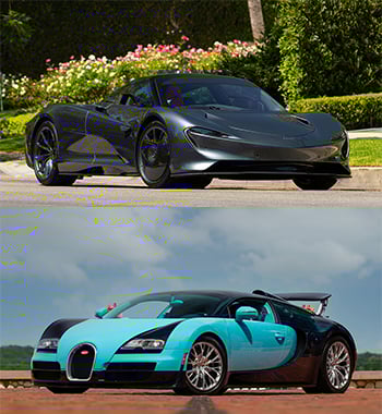 Above: 2020 McLaren Speedtail 728 Miles, No. 91 of 106 Produced. Below: 2014 Bugatti Veyron 16.4 Grand Sport Vitesse Jean-Pierre Wimille Legend Edition 1,185 Miles, 1 of 3 Produced. Credit: Mecum