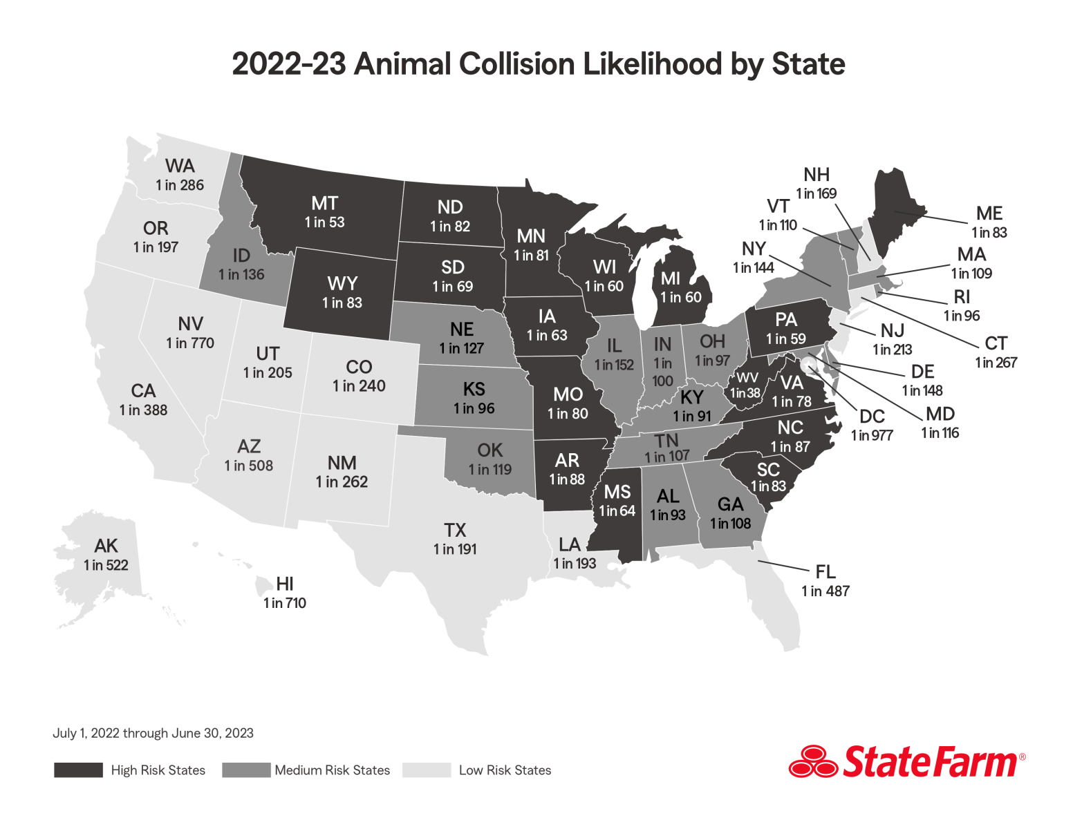 The insurance giant says the odds of U.S. drivers hitting an animal are 1 in 127, according to its latest data. So where are you most likely to hit an animal while driving? Here are the top five most likely states where State Farm says it's most likely to hit an animal while on the road: