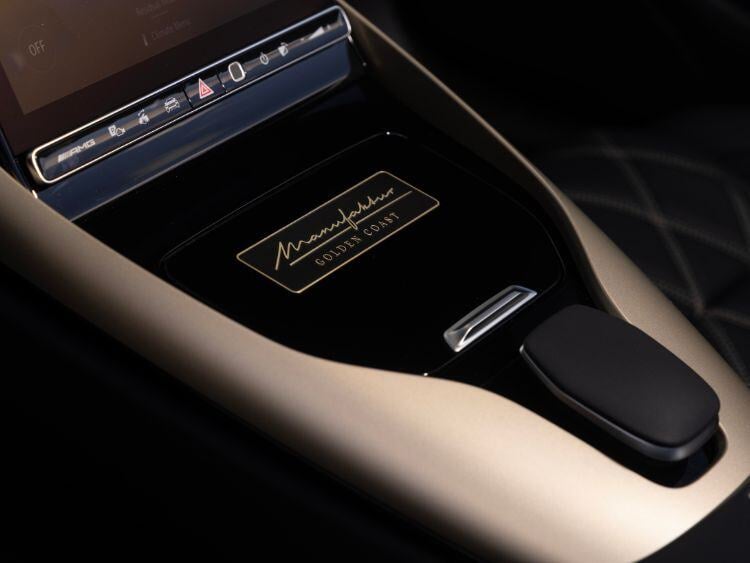 MANUFAKTUR high-pile floor mats with black Nappa leather piping, an embroidered AMG logo and contrast stitching in gold also underscore the superb attention to detail. Unique MANUFAKTUR Kalahari Gold Magno trim elements on the seats, doors panels and center console further accent the interior. A special badge adorns the center console door, emphasizing the special roadster's exclusivity.