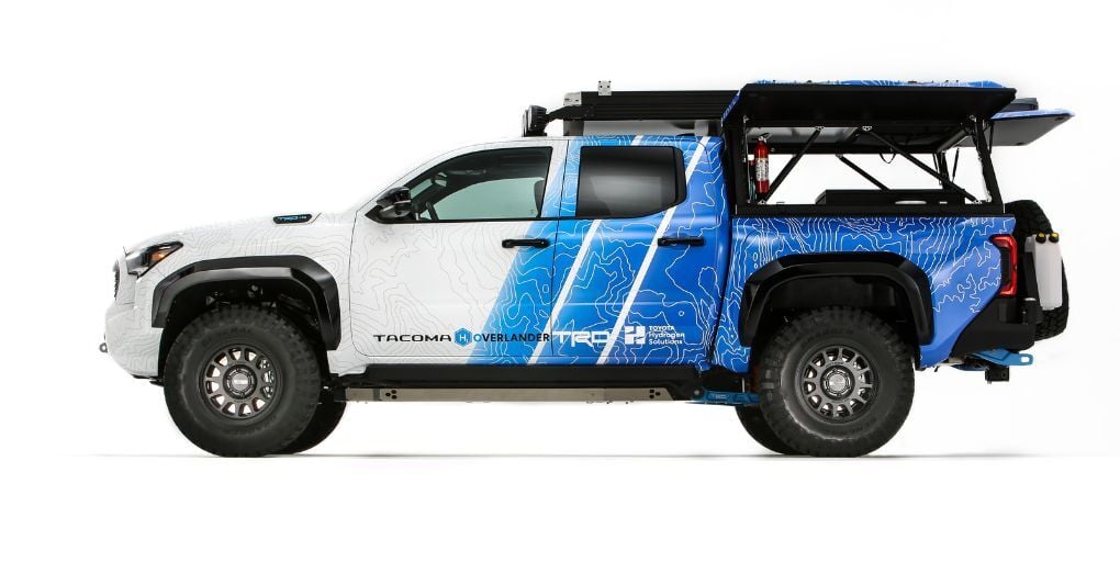 Toyota showed up to SEMA swinging with the Tacoma H2-Overlander Concept, a hydrogen-powered off-road fantasy that makes your standard overland rig look like a lawn chair with headlights. It supposedly cranks out 547 horsepower from a fuel-cell setup fed by three hydrogen tanks and even packs a 25-kWh battery so you can charge your buddy’s EV—or power a small neighborhood if you get bored. The kicker? Its tailpipe doesn’t spew exhaust, it spits water clean enough to shower with. It’s got the full SEMA starter pack too: lifted suspension, 35-inch tires, roof tent, winch, and enough LED lighting to land planes. The problem, of course, is that there are about 59 hydrogen stations in America and 58 of them are in California, so “Overlander” might be a stretch. But credit where it’s due—Toyota’s showing what off-roading could look like when gas and diesel finally give up the ghost. Whether it’s the future or just an expensive art project with great mood lighting, it’s a reminder that Toyota still knows how to build trucks that get attention—even if they only exist to make you say, “wait, I can shower with the exhaust?”