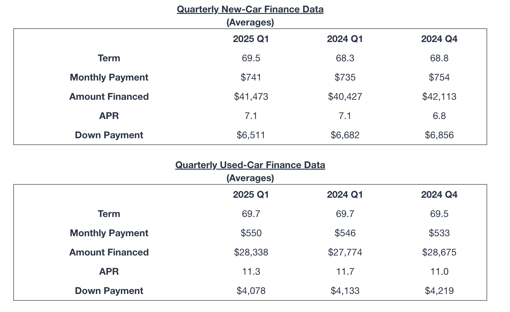 - Consumers are still financing more than an average of $40K for new vehicles: The average amount financed for new-vehicle purchases in Q1 was $41,473 in Q1 2025 compared to $42,113 in Q4 2024 and $40,427 in Q1 2024.
