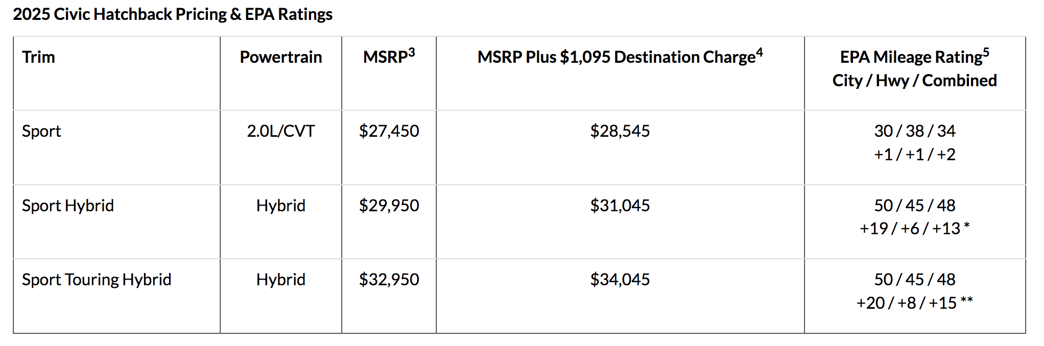 The 2025 Civic Hatchback is available in three trim levels, starting with Sport and topped by the hybrid-electric Sport Hybrid and Sport Touring Hybrid. Prices are below: