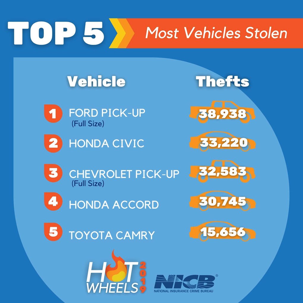 In the 2019 report that includes crime data from across the country, the NICB report ranks the Ford full-sized pick-up truck as the most stolen vehicle in 2019. In fact, four full-size pickup trucks from different manufacturers made the top ten list.