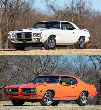 Above: 1969 Pontiac Trans Am 400 CI, Automatic (Lot S48) Below: 1969 Pontiac GTO Judge 400 CI, 4-Speed (Lot S56). Credit: Mecum Auctions.
