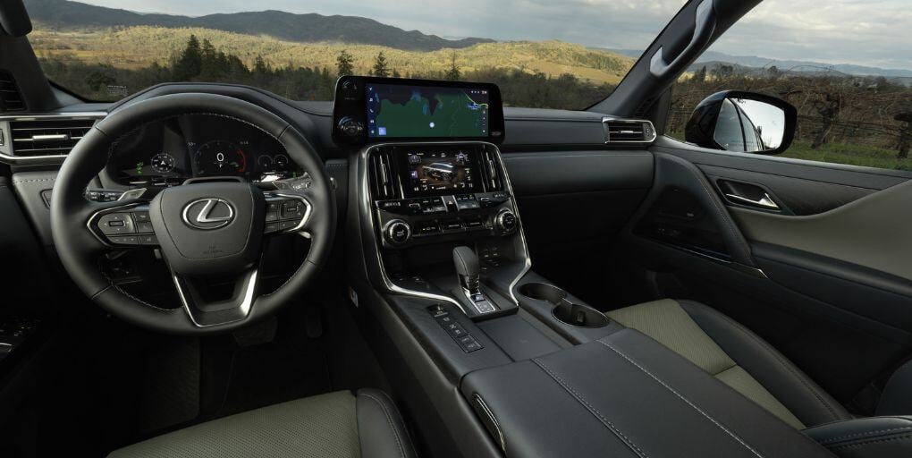The LX 700h's 3.4-liter twin-turbo V6 hybrid powertrain is paired with a 10-speed Direct Shift Automatic Transmission, shared with the LX 600. The hybrid system produces 457 horsepower, 583 lb.-ft of torque, and an improved EPA-estimated combined fuel economy rating of 20 MPG. The battery is located under the luggage compartment for two-row configurations, and beneath the third-row seat for three-row configurations.