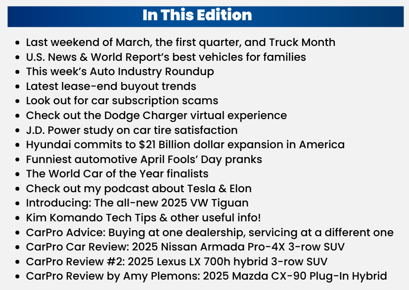 We’ve got tons of info for you today including the U.S. News & World Report list of best family vehicles. I tell you which tire brands are the best, based on J.D. Power. Don’t miss the funniest April Fool’s Day automotive pranks. You can watch a podcast I did all about Tesla and Elon Musk, and I have a warning about fake car subscription scams that could affect you. Scroll all the way to the bottom of this newsletter because there is a TON more that might interest you. Plus, ANOTHER edition of the Auto Industry Roundup that so many of you have told me you loved. Thank you (taking a bow).