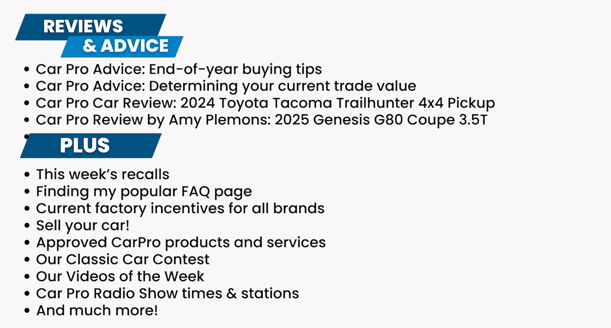 In reviews, I have the terrific Toyota Tacoma Trail Hunter pickup with the iForce Max hybrid engine. Our Amy Plemons reviews the stunning 2025 Genesis GV80 Coupe. In advice today, I give you end-of-year buying tips, how to determine the value of your trade-in before you go see a Car Pro dealer, and also in another article, I give you tips on how to have a great holiday buying experience.
