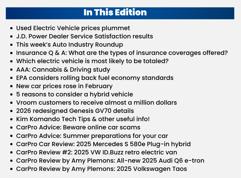 In stories today, one of my favorite surveys: The J.D. Power Dealer Service study results. I also tell you that used electric vehicle prices continue to fall, and in another story, new car average prices actually went up in February, but I also give you the likely reason for that. Thinking about getting a hybrid? I give you 5 compelling reasons you should. I kept warning you about used car dealer Vroom, there is a settlement coming for some of its customers. In our auto insurance Q & A, we answer the question: What types of auto insurance policies are offered?