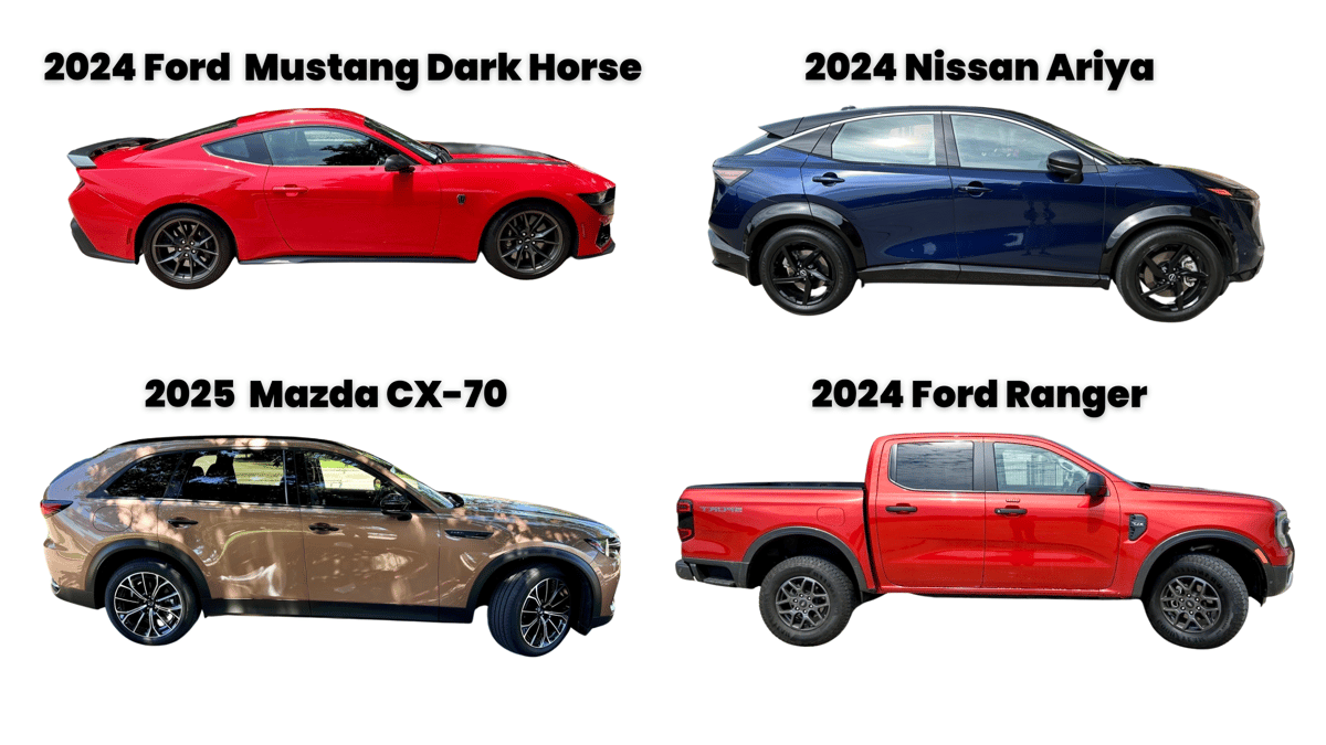 It is a car review extravaganza for you today! Count them, FOUR very different car reviews await you. I had the hot and rare 2024 Ford Mustang Dark Horse with a 5-liter V8 and a six-speed manual. Also, an SUV I fell in love with, the 2025 Mazda CX-70 plug-in hybrid 5-passenger SUV. I also had the 2024 Nissan Ariya all-electric SUV, and finish off with the redesigned 2024 Ford Ranger XLT Crew Cab.