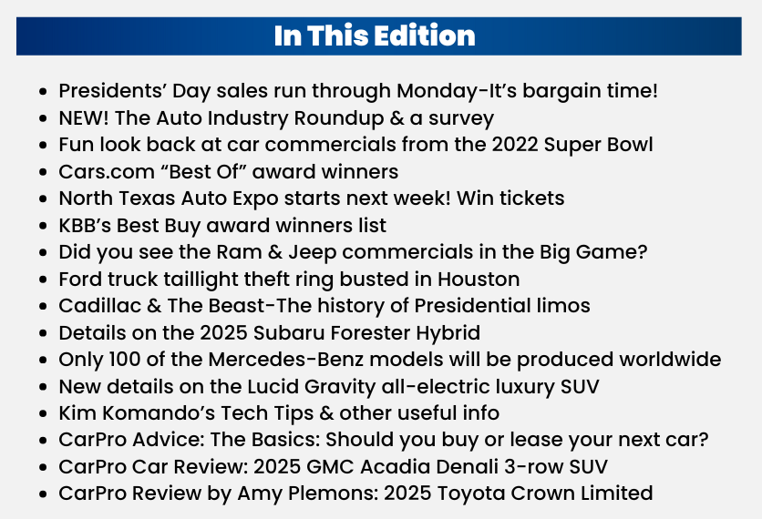 Presidents' Day is Monday, so this is a great weekend to get a new set of wheels if you’ve been thinking about it. I give you the rationale below on why you should look at numbers with a Car Pro Certified Dealer! The Super Bowl was last Sunday and if you missed the Ram truck commercial, and especially the Jeep commercial, we’ve got both for you. PLUS, we look back at the car commercials from 2022, when there were a lot of them. Also below, we’ve got details on the new 2025 Subaru Forester hybrid many have been waiting on, and more details on the beautiful new Lucid Gravity all-electric luxury SUV.