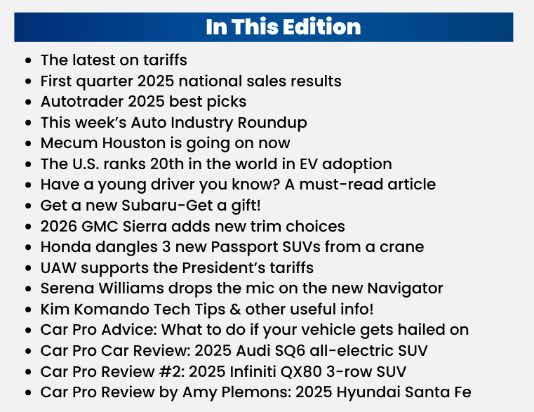 April and the 2nd quarter are here, and it is sure to be interesting with the tariff situation. I will keep you up to speed on everything I know every week. The one thing I am sure of is the auto industry is a resilient group, and if there were any doubt about that, the last five years have proven it beyond a shadow of a doubt. I have the first quarter sales results for you today, with all the automakers reporting. We start today off with the latest on tariffs.