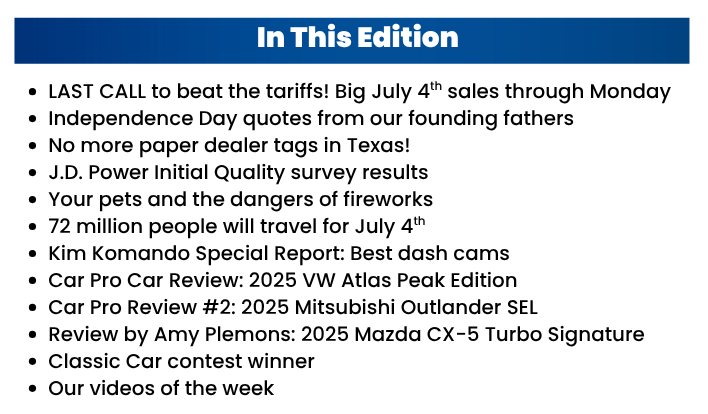 Surprise! Yes, we are in your inbox early because I know most of you are going to be off on Friday. A couple of things you need to know: First, WE ARE LIVE inside your radio Saturday to help last minute car buyers take advantage of incentives that were extended, and the hard deadline to beat vehicle prices rising due to the tariffs. Yes, higher prices are coming and the only way to avoid it is to do something by Monday night. More on that in our lead story below. Second, this is an abbreviated edition since we didn’t have the full week to work on it due to July 4th.