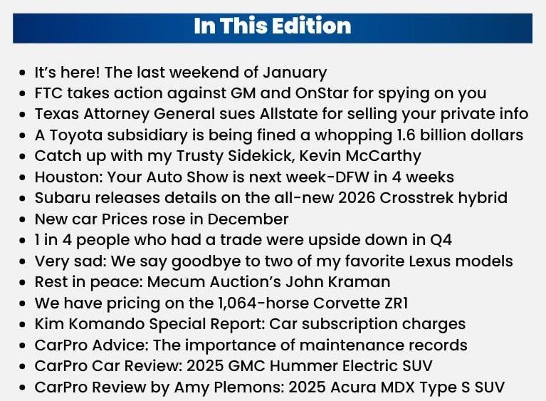 Here we are again, looking at the last weekend of the month. I talked a lot last Saturday on the radio show about the atmosphere at dealerships in January. The pace slows down, dealers need the business, especially when their month has been hampered by cold temperatures and often precipitation. Friends and listeners in the California areas affected by the fires, we are still here for you and you remain in our thoughts and prayers.
