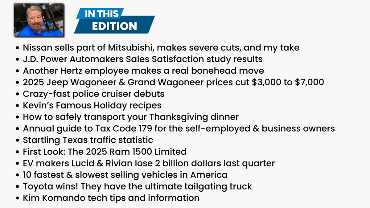 EV makers Rivian & Lucid had a rough 3rd quarter combining to lose 2 billion dollars, story below. Also below, I give you the fastest and slowest selling vehicles in America. I’ll tell you all about a police cruiser you don’t want to try to run from, and don’t miss Kevin’s Famous Recipes with Thanksgiving coming. As a bonus, we tell you how to safely transport your dinner to Grandma’s house.