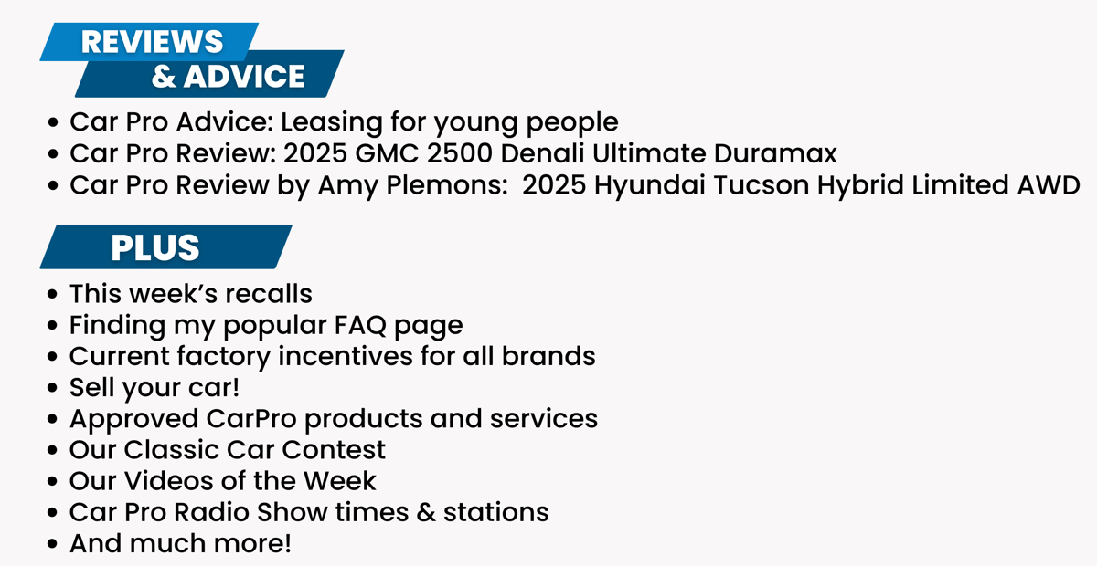 We so appreciate all of you who take this newsletter and listen to the show every week. We know that without you, there is no Car Pro Radio Show. So always let us know when we can help you. If you have not been there lately, take a look at our website, www.carpro.com, it changes all the time!