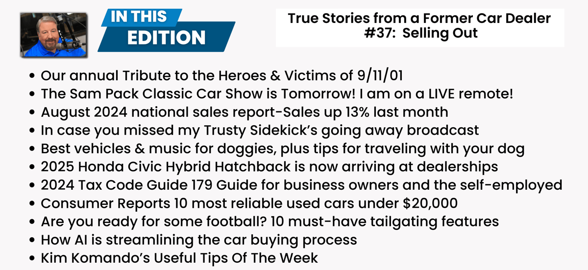 We have another True Story from a Former Car Dealer below. This is a series of 40 stories written by me, and we’re down to just three more after today. Today, #37 is titled: Selling Out. I give you my highs and lows of my car business career, and I lay it all out on how I came to the extremely difficult decision to sell my dealerships, which led to my career on the radio airwaves. I keep no secrets on this story, friends.
