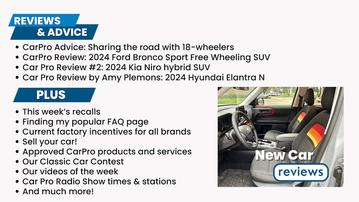 We so appreciate all of you who take this newsletter and listen to the show every week. We know that without you, there is no Car Pro Radio Show. So always let us know when we can help you. If you have not been there lately, take a look at our website, www.carpro.com, it changes all the time!