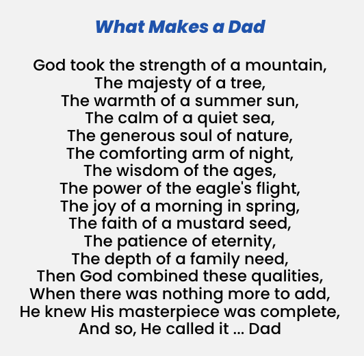 We start today by honoring the dads who are reading this newsletter. Like the moms, Dads are special too, and have a special bond with their children. There is no substitute for the love of a dad, so today we give you a history of Father’s Day, a poem, and a very touching video that is only a minute long. Feel free to pass this on to any dad you consider to be a great one, including your own! I was blessed to have 30 Father’s Days with my son before he passed away, so if your children are still with you, count your blessings.
