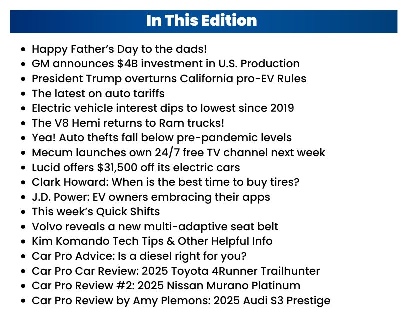 In big stories this week, yesterday President Trump officially rolled back California's pro-EV rules, we have the latest on that breaking news below. Also, GM announced plans to invest $4 billion in its U.S. plants to build more vehicles here. We also find out that interest in electrics is at its lowest level since 2019. Meanwhile, auto thefts saw their biggest decline last year in 40 years, and that is certainly welcome news.