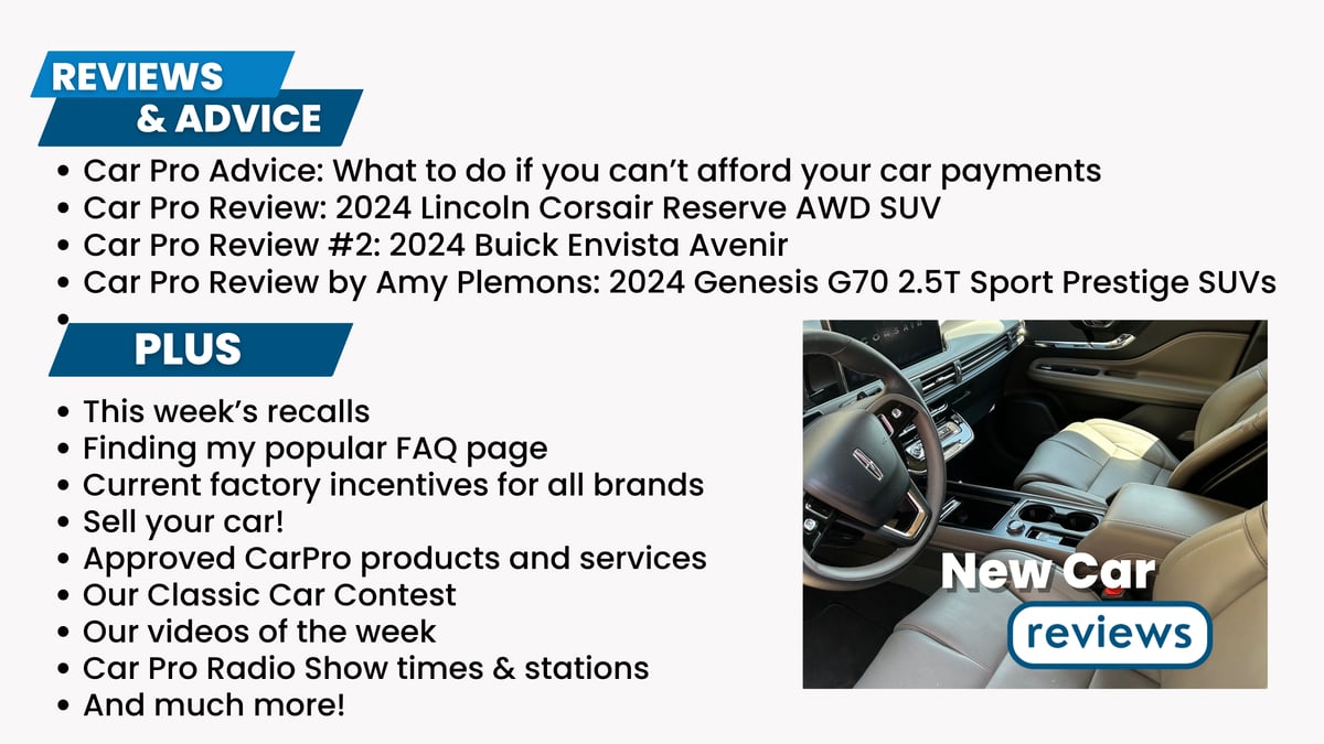 We so appreciate all of you who take this newsletter and listen to the show every week. We know that without you, there is no Car Pro Radio Show. So always let us know when we can help you. If you have not been there lately, take a look at our website, www.carpro.com, it changes all the time!