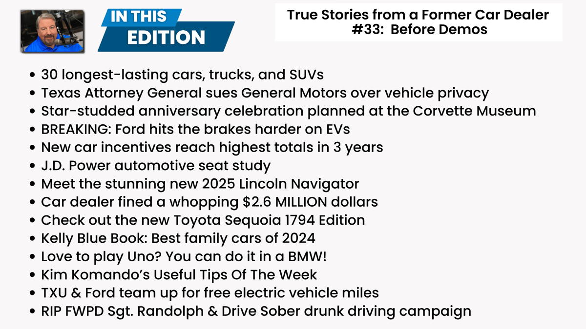 We kick it off today with a study that identifies the 30 longest-lasting cars, trucks, and SUVs available. Hint: Toyota does very well here. The Attorney General of Texas has dropped a lawsuit on General Motors for sharing your data, a topic we’ve covered extensively here, so can the other guilty automakers be far behind? Good news for car buyers: Incentives on new cars are at a 3 year high right now, and in a move that will make bad car dealers take notice, the FTC and Arizona have fined a car dealer 2.6 MILLION dollars for doing crap I talk about on the radio show all the time, and I couldn’t be happier!