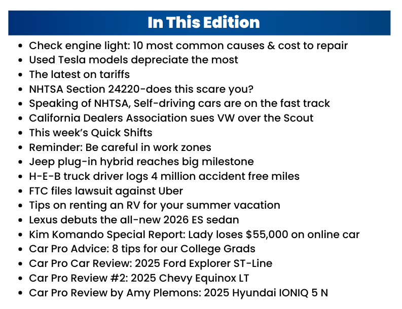TONS of good info today, be sure you go all the way to the bottom. I have the annual report on check engine lights, the causes and the average cost to repair. Remember NHTSA section 24220, I tell you all about it today, and many of you will not like it. I tell you about a truck driver that hit 4 million miles with a perfect record, and in my Quick Shifts column, I have one more thing to add to the list of things left in Uber’s, Easter eggs and your car, go easy on the hood of the Dodge Charger, and California is running rapidly out of license plates. Plus, much more.