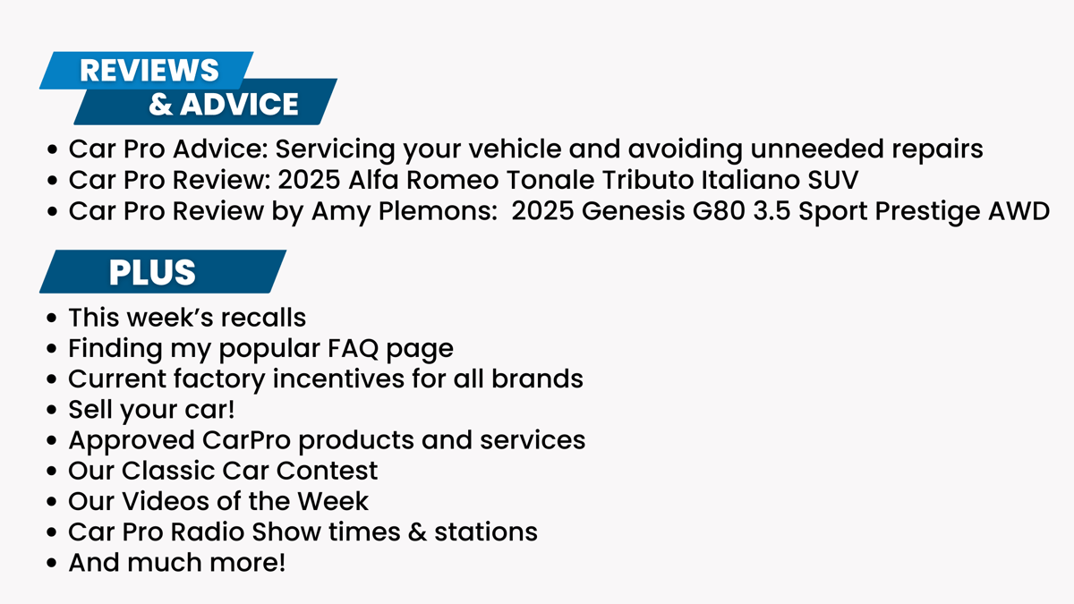 We so appreciate all of you who take this newsletter and listen to the show every week. We know that without you, there is no Car Pro Radio Show. So always let us know when we can help you. If you have not been there lately, take a look at our website, www.carpro.com, it changes all the time!