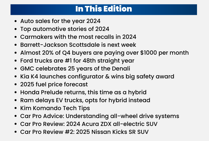 Today, we look back at 2024 with auto sales and how each car company fared. I recount for you the top automotive stories of the year, and I tell you which automakers had the most recalls, an award no automaker wants to win. Also below, we look ahead to what fuel prices will likely be this coming year.