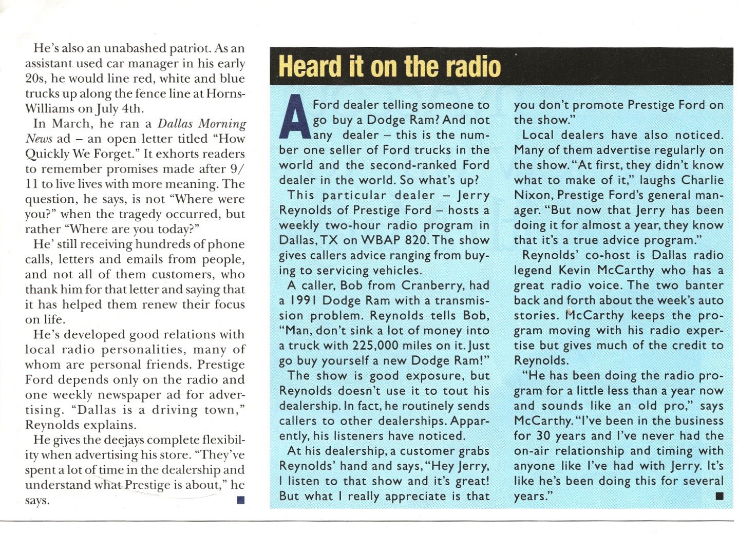 Jerry Reynolds, owner of Prestige Ford in Garland, TX, is as patriotic as they come. So when U. S. forces went to Iraq, he took out full-page newspaper ads in the form of personal letters voicing his sentiments and hopes for their safe return.
