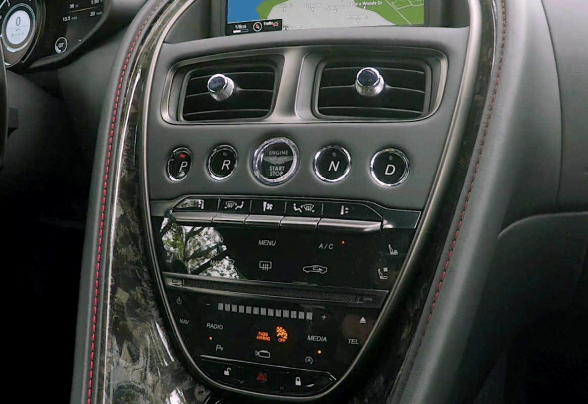 The ignition button sits center dash, and so do the buttons for the transmission. Above that is the 8” navigation screen that is controlled from the center console, and that is where you control the Bluetooth, all the audio options, and it houses the terrific rear view camera the DB11 has. The Bang & Olufsen stereo sounds amazing with speakers rising out of the dash when you start the car.