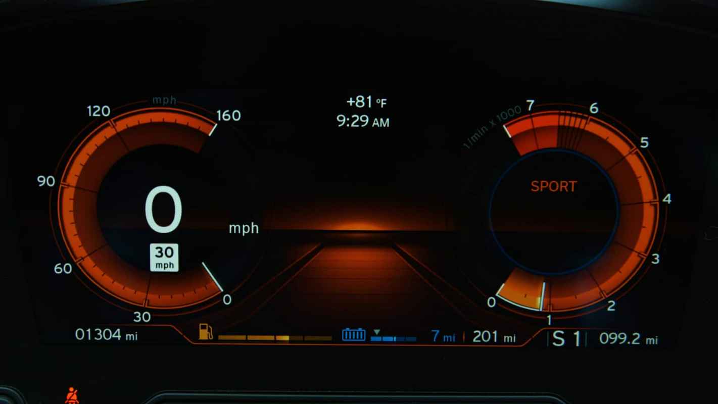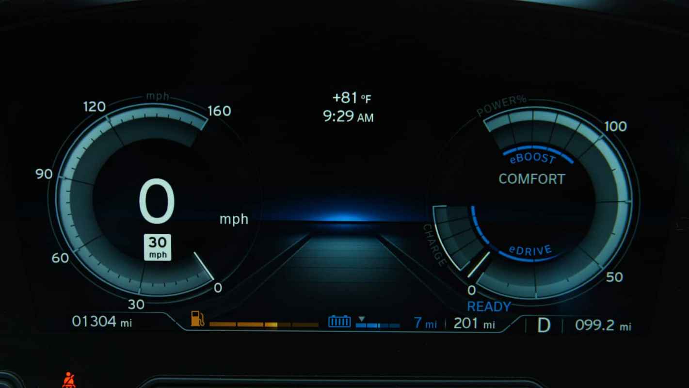 The gauge cluster is high-resolution and changes colors depending on the drive mode you are in. It also lets you know how much gas you have left and how much battery power you have left. As you look through the windshield, there is a bright, colorful, head-up display.