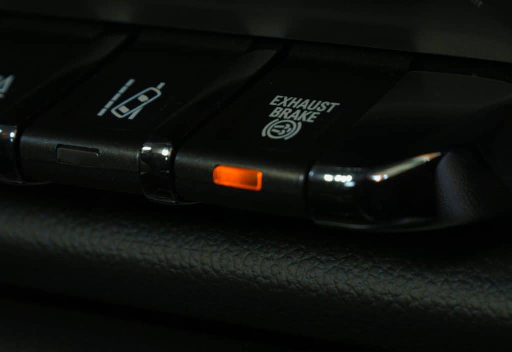 Just below the screen are your radio controls, the climate-controlled air conditioning, and controls for the heated and cooled seats. Below that is a row of buttons that operate the adjustable pedals, the traction control, the exterior cab lights, parking sensors, lane departure warning, and the exhaust brake.