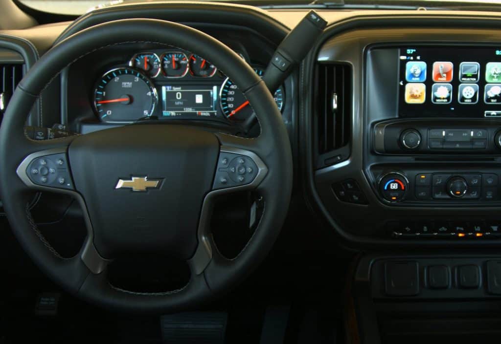 To the left of the steering wheel are light controls, a knob to engage the 4-wheel drive system, and the built-in trailer brakes. To the right is the color screen to operate the Chevy MyLink system.