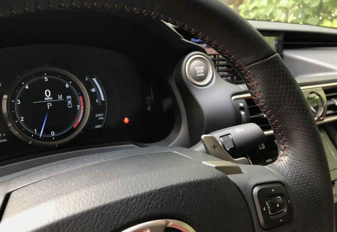 The interior of my F Sport impresses from the moment you open the door. You're immediately greeted by glorious red leather bolstered seats that fit me like a glove, perfect for taking tight corners. The driver's seat is 10-way, 2-way lumbar power adjustable and both front seats are heated and ventilated. You can tell designers spent a lot of time on the cabin. It's well laid out, snug and envelops the driver in soft-touch, refined materials. I'm a fan of the perforated leather-wrapped steering wheel with paddle shifters and the steering wheel-mounted controls are a breeze to operate. I also really love the motorized LFA-inspired TFT-combination tachometer. It cleverly retracts and slides over to show all of your menu items which you can scroll through. The one thing that did catch me by surprise is the push button stop/start sits high behind the steering wheel, so I had to reach for it.