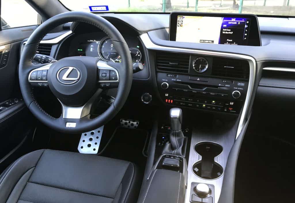 My two-row tester seats five (though it's worth noting that Lexus is working on a new three-row RX possibly due out as a 2019 model.) The all-black leather interior is luxurious, as you'd expect, well-thought-out, and full of quality, soft-touch materials. The leather-wrapped, heated, steering wheel is equipped with easy to use controls. Aluminum pedals greet your feet underneath.