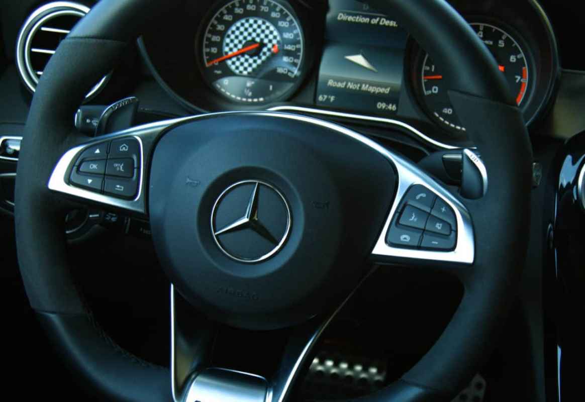 The gauges are easy to read with a 180-mile per hour speedometer on the left, and a tachometer on the right that redlines at 6500 RPM. Between those is a driver info center that operates from the AMG flat bottom, heated steering wheel.