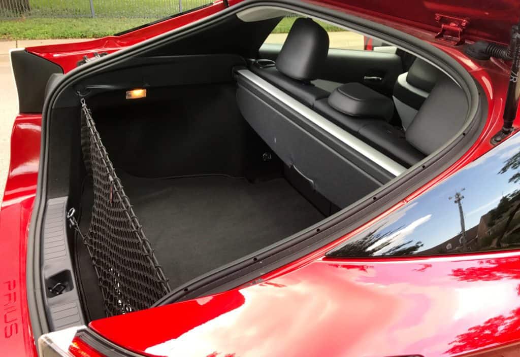 My interior is a high-contrast Cool Gray and Black. The Touring's 8-way power-adjustable driver’s seat with lumbar support is a treat I didn't expect. The heated front seats are covered with SoftTex, Toyota's synthetic version of leather, with Touring-exclusive contrasting blue stitching. The material feels comfy but doesn't breathe exceptionally well especially in hot weather. Other cabin highlights include the Touring's leather-wrapped steering wheel with easy to use controls to access the audio system smartphone, and available safety features like Lane Change Assist and Intelligent Clearance Sonar, a collision avoidance system if you're going less than 9 miles an hour. The start button is easy to reach just to the side of the steering wheel, but don't expect to hear an engine start. It's eerily quiet thanks to the hybrid engine. What you will hear though is an almost ear piercing warning sound anytime the backup camera is engaged. I much preferred the great sound coming from my tester's 10-speaker JBL audio system. The large, glossy, 7-inch dual-display infotainment touch screen is responsive and easy to navigate. But don't leave home without taking a cloth with you, because it gets dusty fast. My Touring model was equipped with Toyota's Entune app suite. It also offered Qi-compatible wireless smartphone charging (sorry, no iPhones.) One thing I'm not sure I ever got used to is the placement of the digital tachometer. It’s not in the driver’s line of sight but rather in the middle of the car above the center console, so you have to glance to the right to see it. It's where you find info on everything from your fuel gauge and mileage to different drive modes, energy usage, and engaged safety features. The 5-seater is roomy both in the front and back. Standard Prius features inside include Toyota's Smart-Flow Climate System, but shockingly I'm not seeing any back seat air vents. But the rear does get one of the car's two 12-volt outlets. Cargo space is a roomy 34.3 cubic feet with the 60/40 split seats up. Fold them down for up to 65.5 cu. feet. My Touring also had an add-on Cargo net and carpet floor mats. One issue I did have was visibility out the back. The dual pane glass rearview mirror on the hatchback threw me off a bit and I found the center divider impeded my view. A couple of other things to note about the interior. Ergonomically speaking, the center console, which opens to the side, was too high to moonlight as my armrest. Also, there is a ton of glass real estate on this car. The problem is the front visors only reach about halfway across the windows so they don't completely block the sun. I'd also point out the cool gray interior proved somewhat problematic on the dash. It's bright and distracting in the sun. There isn't a moonroof on my tester, but one is available in an Advanced Technology Package for the Prius Three and Four that also gives you a color heads-up display. (It is not available on the Touring trim.)