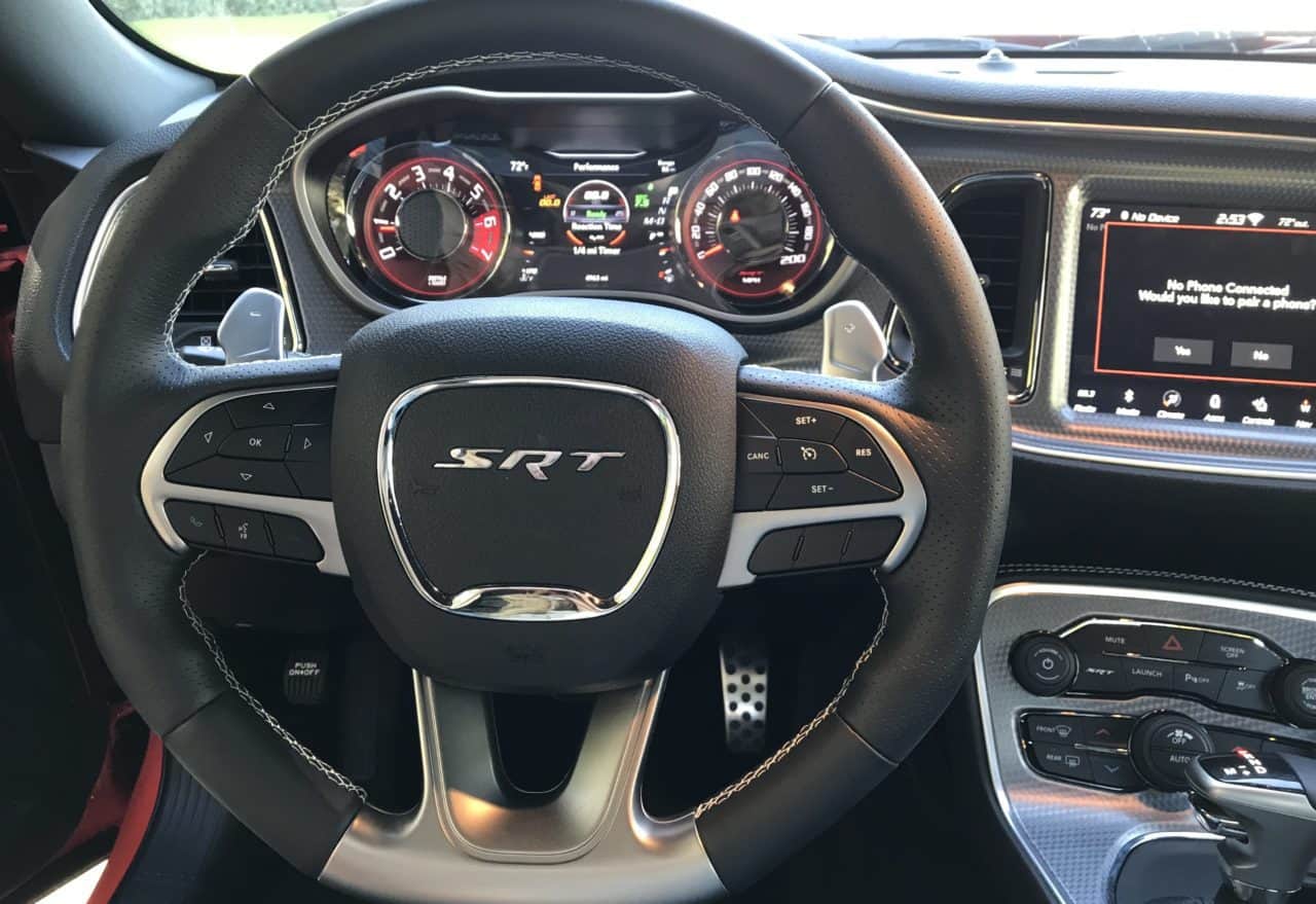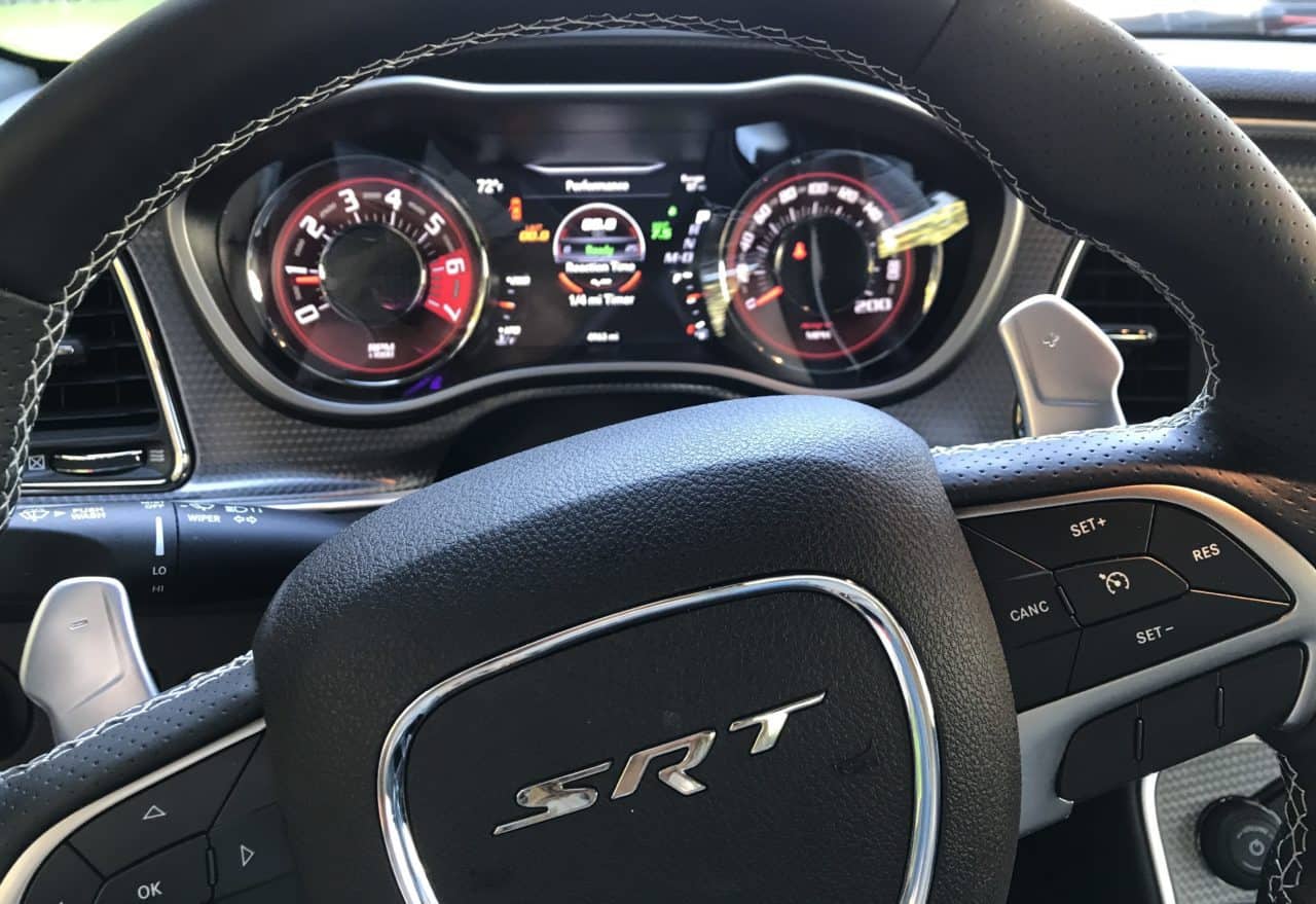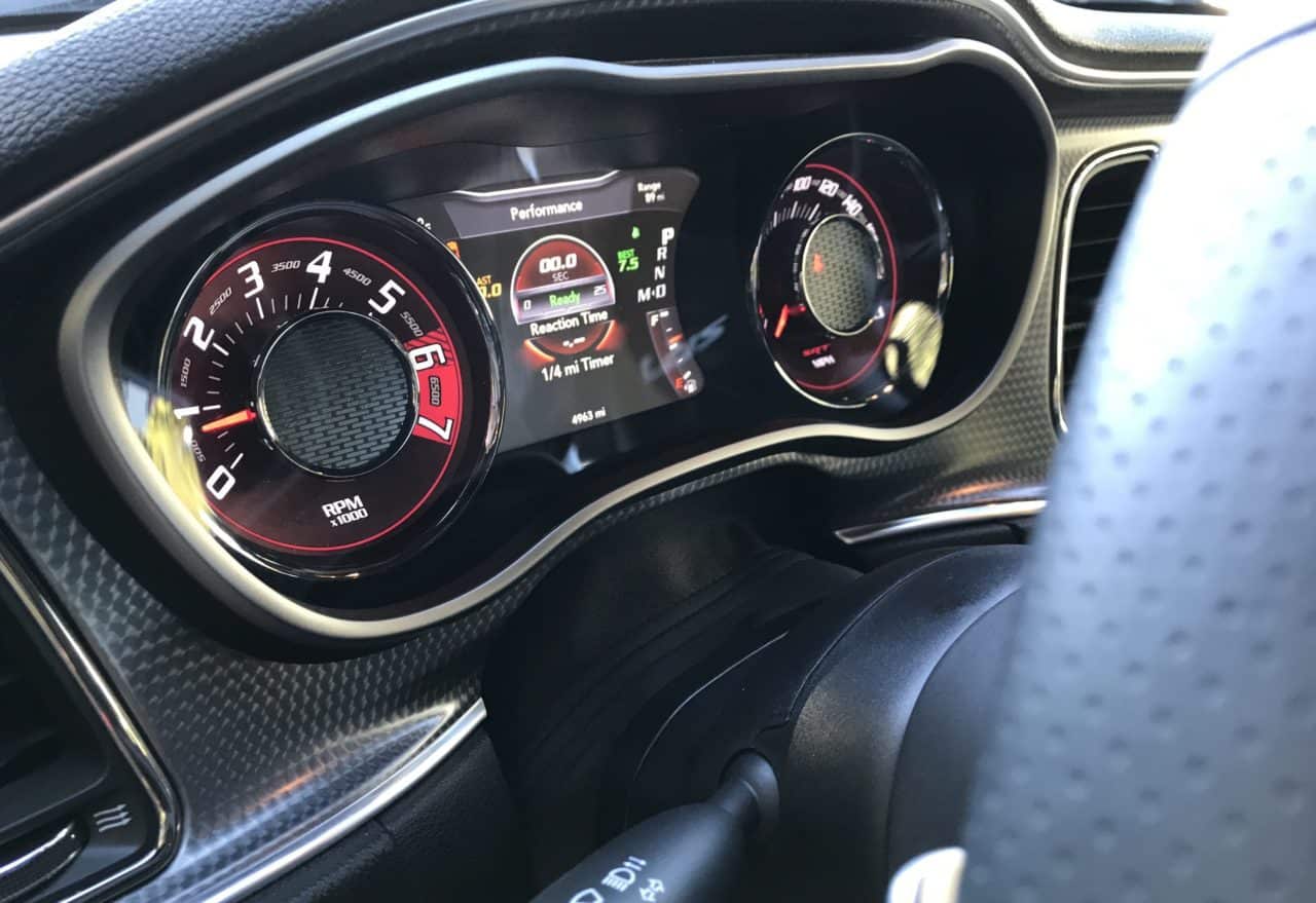 On the Uconnect screen, you’ll have a blast going through all the apps, especially the Performance Pages where you can configure the car any way you wish. The gauge cluster is bright with a driver information center in the middle.
