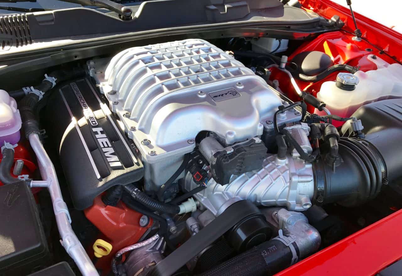 The Hellcat is an unusually heavy car for its category, tipping the scales at 4500 pounds. Of course, the engine itself adds a lot of weight, but this is a large car, and especially now with the extra width. Even under heavy acceleration, the Hellcat engine stays cooled, thanks to the functional hood scoop, and air dams around the headlights and under the front bumper.