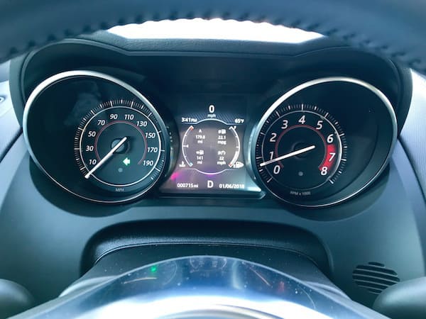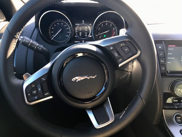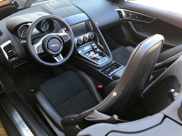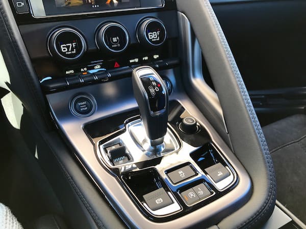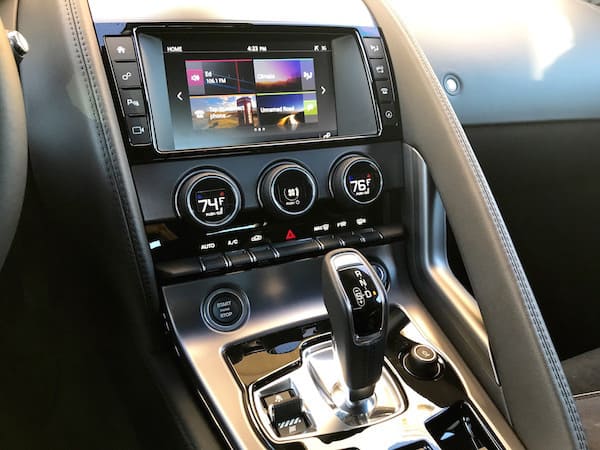 The F-Type is every inch a sport haven inside with new, light, slimline leather/suede cloth 12-way power memory seats. Jaguar's designers really got the ergonomics perfect as far as I'm concerned. The interior is sleek, minimalistic and modern with satin chrome finishes. The cushy heated steering wheel features paddle shifters. Above the steering wheel, the 5-inch digital driver's display with chrome dial rings is easy to read. Deployable air vents pop up out of the dash for some hide-and-seek action. You won't miss the huge temperature digits shown on the climate controls either. Note the gear shifter uses a button to put it into park.