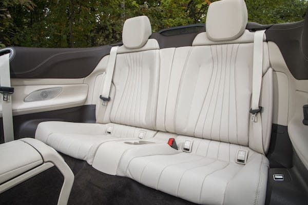 Like most Benz models, the 2018 Mercedes-Benz E400 Cabriolet has an exceptional interior with attractive stitching and this one has optional flowing line wood. As soon as you open a door, you see this is a real 4-seater convertible. Many convertibles won’t fit two adults in the back seat, and access is easy with electric sliding front seats.