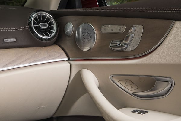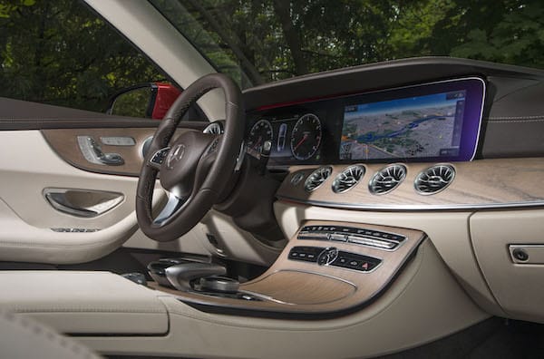 This car has over $17,000 in options. The Lunar Blue paint and designo wood account for about $2000 of that. The three major options are the Airbody controlled suspension system which firms up the car in corners, and softens the ride on rough roads. This costs $1900. The second runs $9350 for the Premium 3 package. Notable in it is park assist, wireless phone charger, Burmeister sound system, lane change assist, emergency stop assist, blind spot monitoring, evasive steering assist, and a head-up display with speed limit sign recognition. One note on the head-up display, it is exceptional. It reads the speed limit sign and puts it next to your actual speed. If you go over the limit, it flashes at you for a moment. Finally, the AMG package is $2500.