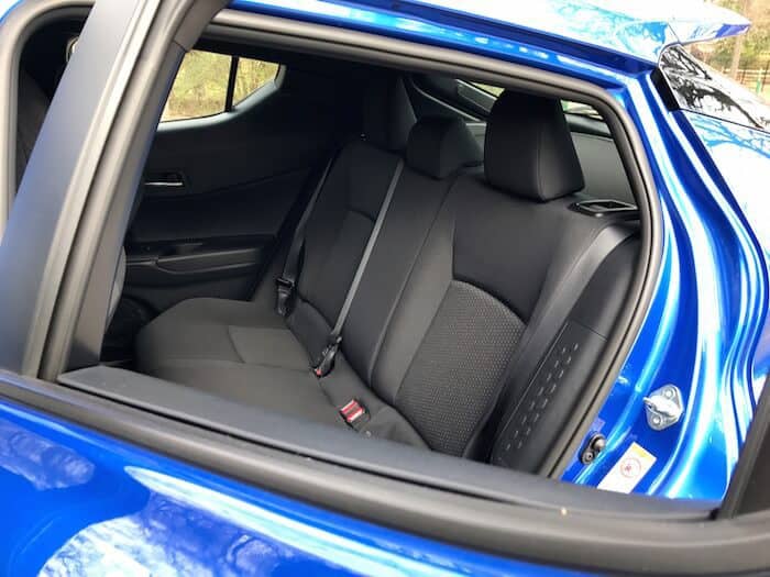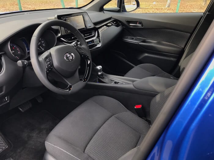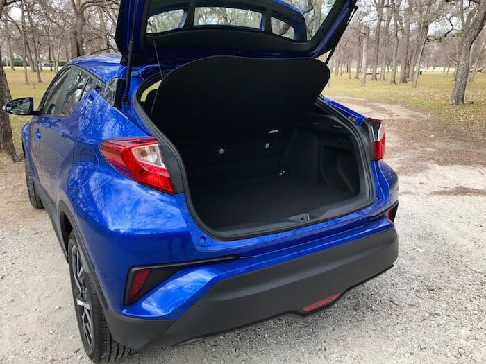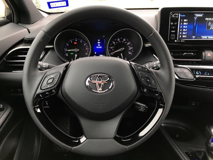 To love the C-HR you have to love a stark black interior because it's the only option for either trim. It's pretty dark in there, with all black surfaces and a glossy black lint-attracting trim around the 7-inch touchscreen and dual climate control area. Toyota does attempt to make things a little more interesting with some diamond-patterned surfaces. The XLE's sport-bolstered heated front cloth seats are comfortable, but if you're hoping to upgrade to some sort of leather, you can't. Also, the XLE Premium only offers power lumbar support. All other seat adjustments are manual. The dash is soft to the touch, along with a leather-trimmed tilt/telescopic steering wheel and gear shifter. The XLE Premium comes with push-button start. The tachometer and 4.2-inch driver display screen are standard Toyota. I enjoyed using the voice-activation system, which performed well for me. The C-HR gets my thumbs up for cabin ergonomics. The steering-wheel-mounted controls and center console buttons are shaped to fit your fingers as they naturally fall diagonally when reaching for the controls. The touchscreen and console area is also slightly angled towards the driver's seat for easier viewing. However, don't expect to pull up a camera view there. The rearview camera is integrated into the auto-dimming rearview mirror. A standard electric parking brake with a brake-hold feature is also a plus. It's roomy in both the front and back and features a 60/40 split fold-flat second-row rear seat with adjustable headrests. Cargo room is fine.